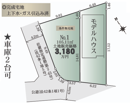 - 南西側4.5m公道、西側4.2m位置指定道路