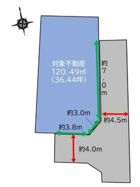 - 東側幅員4.5m公道に約7.0m接道、南側幅員4.0m公道に約3.8m接道