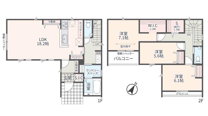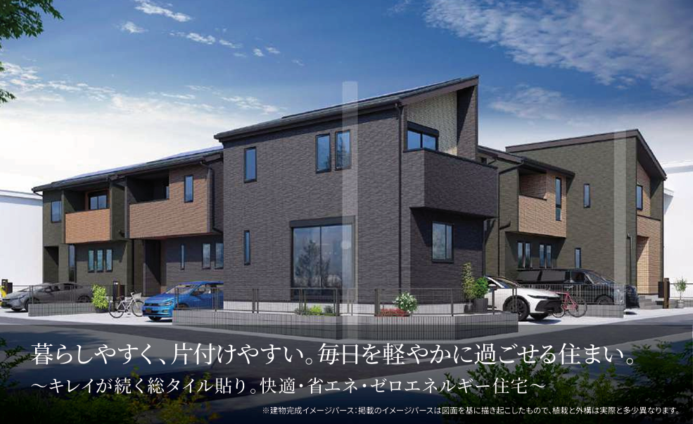 太陽光発電システム、リビング天井高2,600、リビングハイドア、納戸、W.I.C、S.I.C、アクセントクロス、アルゴンガス入りハイブリッドサッシ、網戸、室内物干し、LEDダウンライト、センサーライト、玄関スマートロック、カラーモニター付インターホン、宅配BOX、電動シャッター、外水栓、EVコンセント、外壁タイル貼り