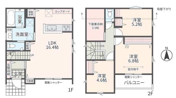 保温浴槽、浴室暖房乾燥機、三面鏡付き洗面化粧台、洗面タッチレス水栓、1F・2Fウォシュレットトイレ、トイレ収納、ガスコンセント