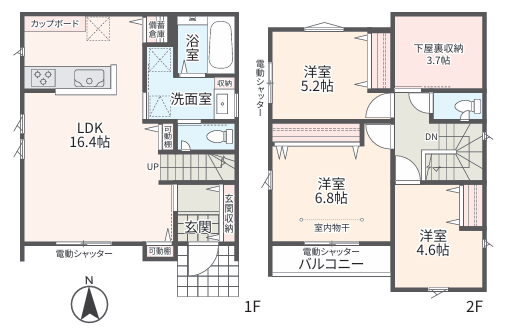 制震装置マモリー搭載、太陽光発電システム、リビング天井高2,600、リビングハイドア、LDKダウンライト、下屋裏収納、アクセントクロス、サッシ、網戸、室内物干し、センサーライト、カラーモニター付インターホン、玄関スマートロック、宅配BOX、電動シャッター、外壁タイル貼り、外水栓、EVコンセント