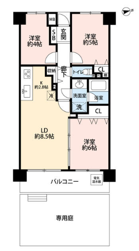 - オール電化、IHクッキングヒーター、3口以上コンロ、オートバス、追焚機能、シャワー付洗面化粧台、温水洗浄便座、室内洗濯機置場、収納スペース、モニター付きインターホン、モニター付きオートロック、専用庭、バルコニー(面積:8.40㎡)、エレベーター