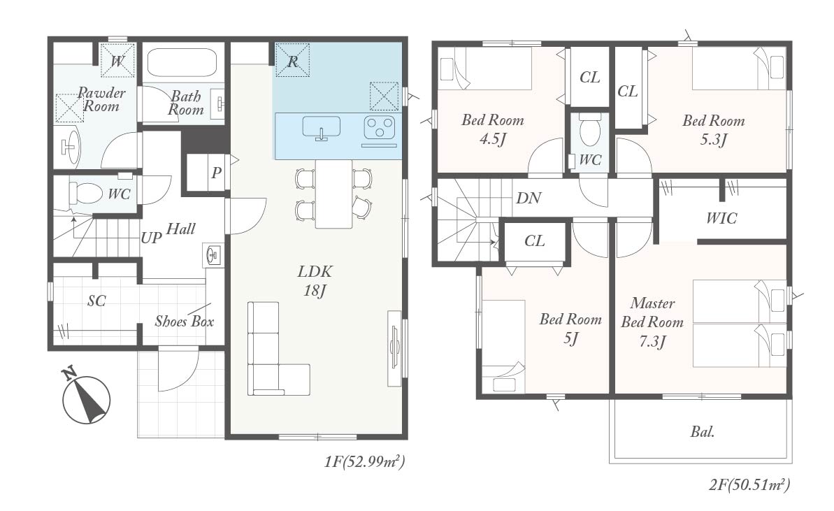 - ペニンシュラキッチン、食洗機、浴室暖房乾燥機、シャワートイレ(1F・2F)、セカンド洗面台、24時間換気システム、アクセントクロス、収納多数、ウォークインクローゼット、シューズクローク、電気施錠スマートコントロールキー、カラーモニター付インターホン、宅配ボックス、金属留めサイディング