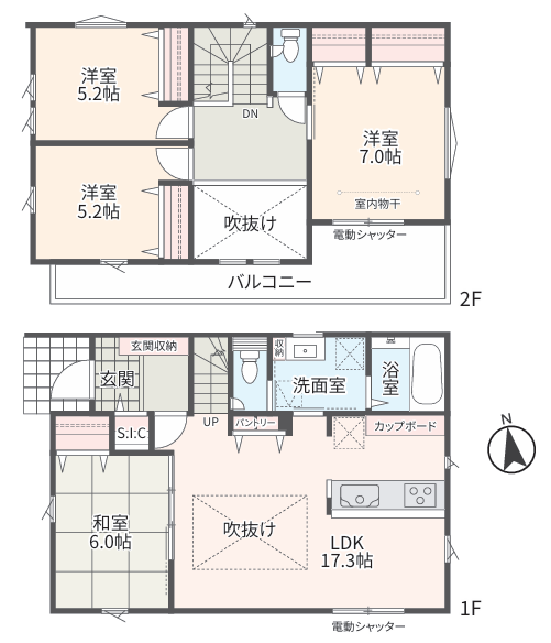 太陽光発電システム、リビング天井高2,600、リビングハイドア、S.I.C、アクセントクロス、高断熱樹脂サッシ、アルゴンガス入りLow-E複合ガラス、網戸、室内物干し、LEDダウンライト、センサーライト、玄関スマートロック、カラーモニター付インターホン、宅配BOX、電動シャッター、サイディング、外水栓、EVコンセント