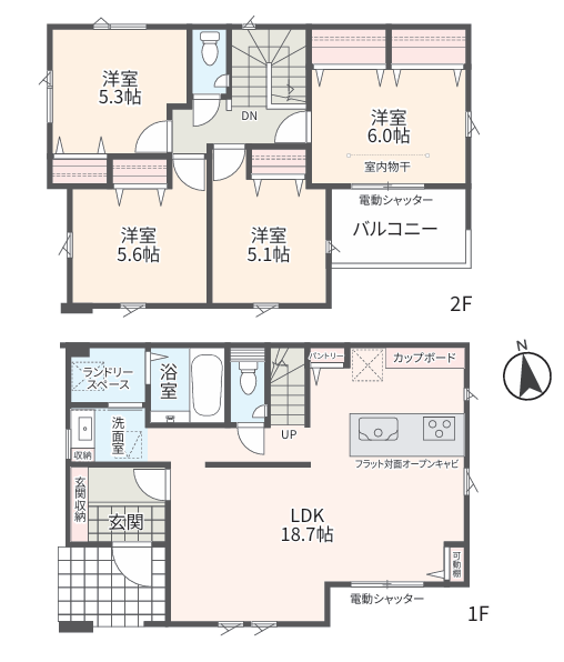 太陽光発電システム、リビング天井高2,600、リビングハイドア、アクセントクロス、高断熱樹脂サッシ、アルゴンガス入りLow-E複合ガラス、網戸、室内物干し、LEDダウンライト、センサーライト、玄関スマートロック、カラーモニター付インターホン、宅配BOX、電動シャッター、サイディング、外水栓、EVコンセント