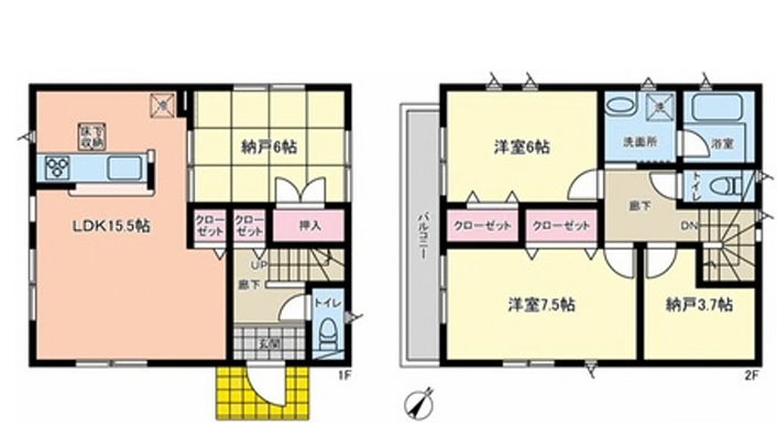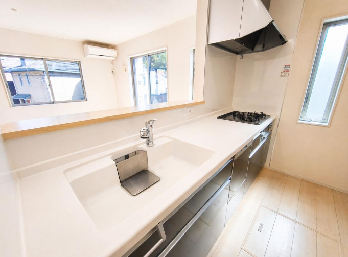 - システムキッチン、食器洗浄乾燥機、3口ガスコンロ、床下収納、トイレ2ヶ所、温水洗浄便座、全居室エアコン、全居室フローリング、納戸、クローゼット、バルコニー